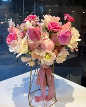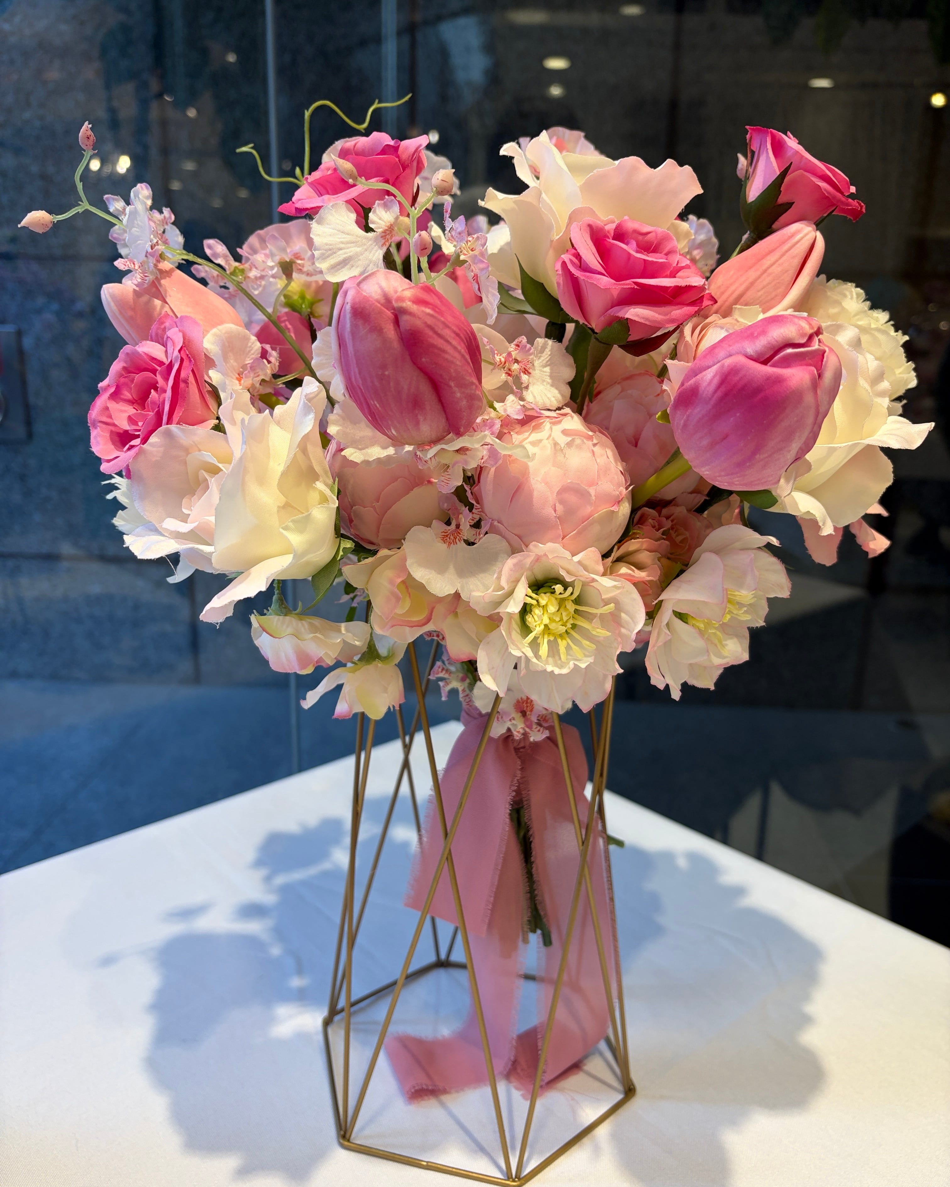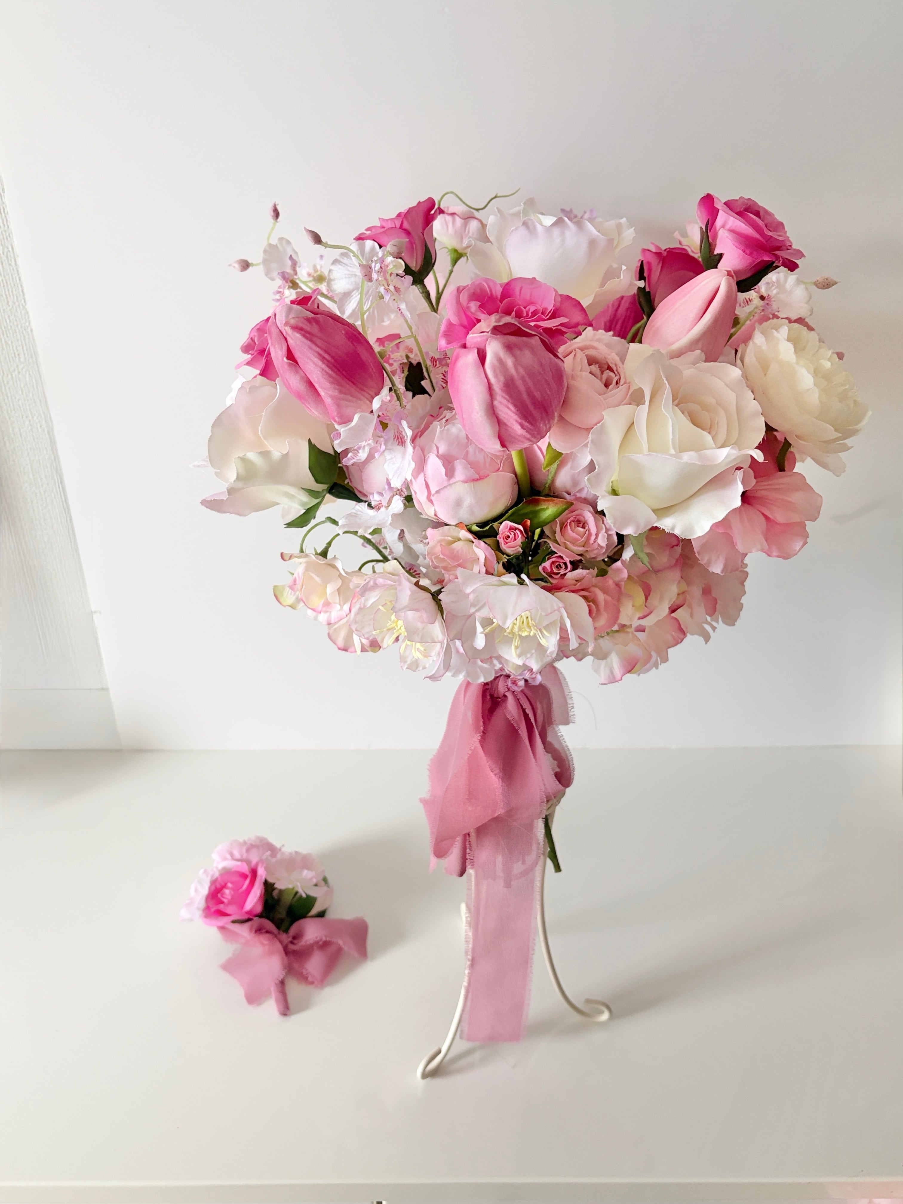 大人気のチューリップと芍薬のつぼみ、スプレーバラをふんだんに使用したブーケです