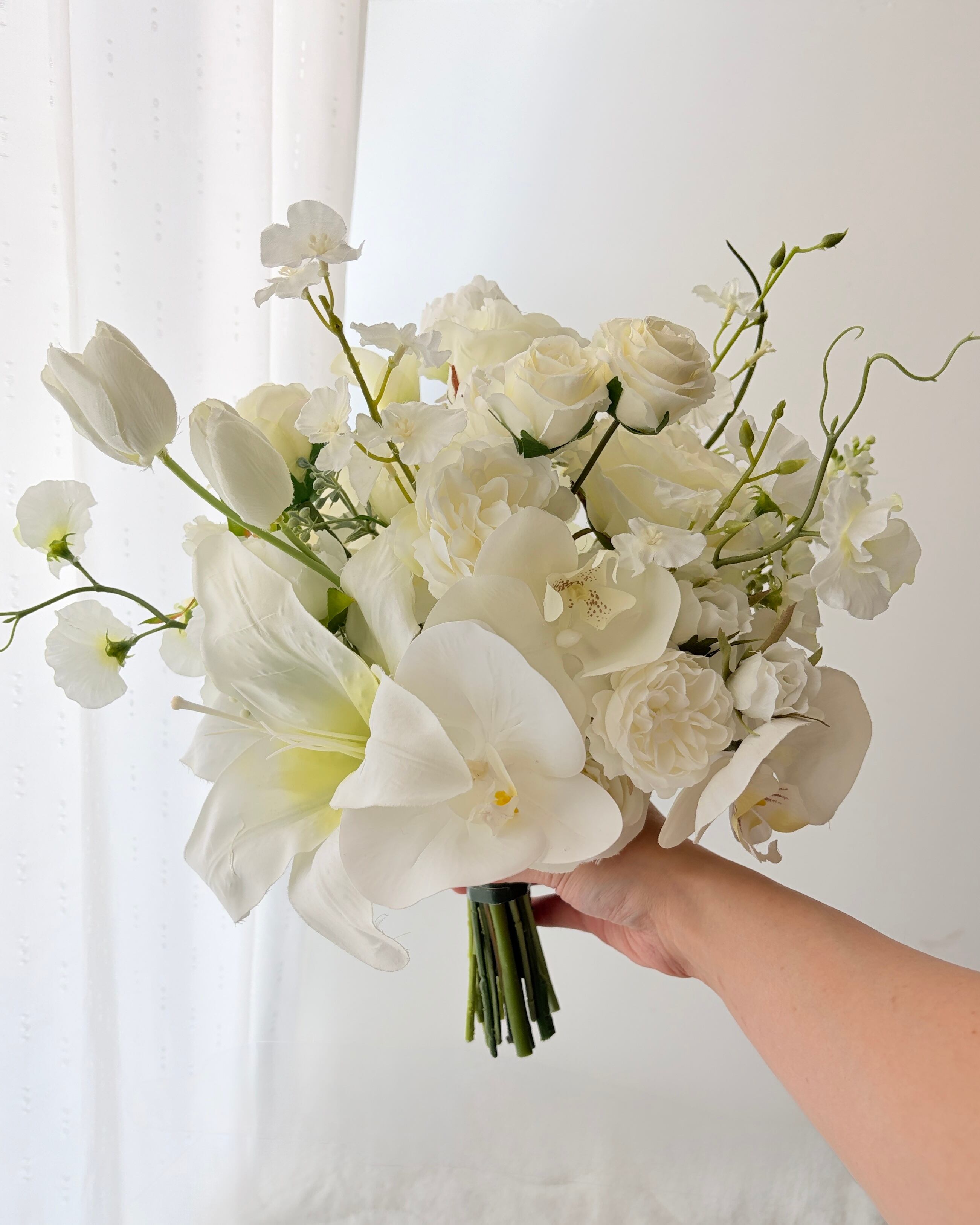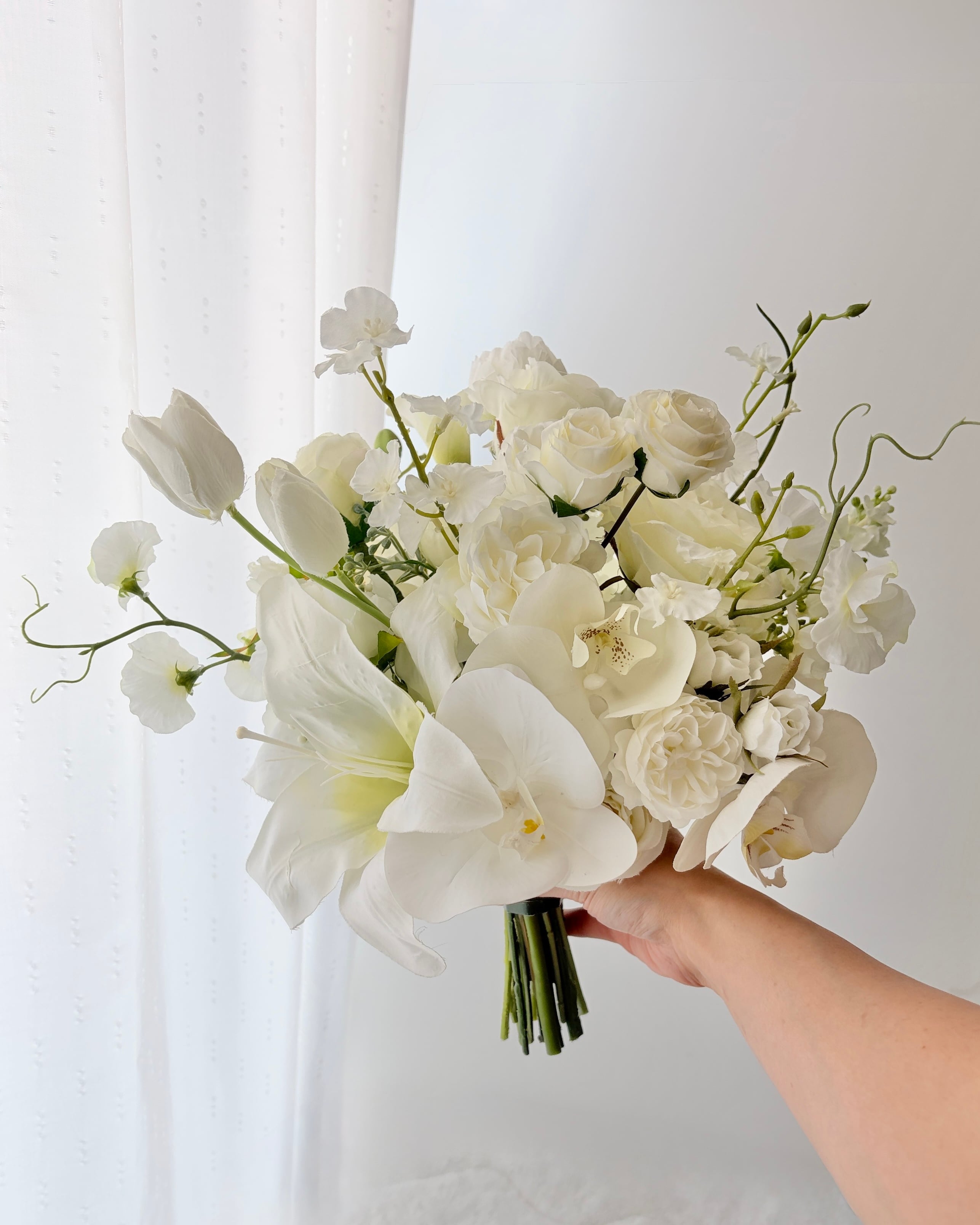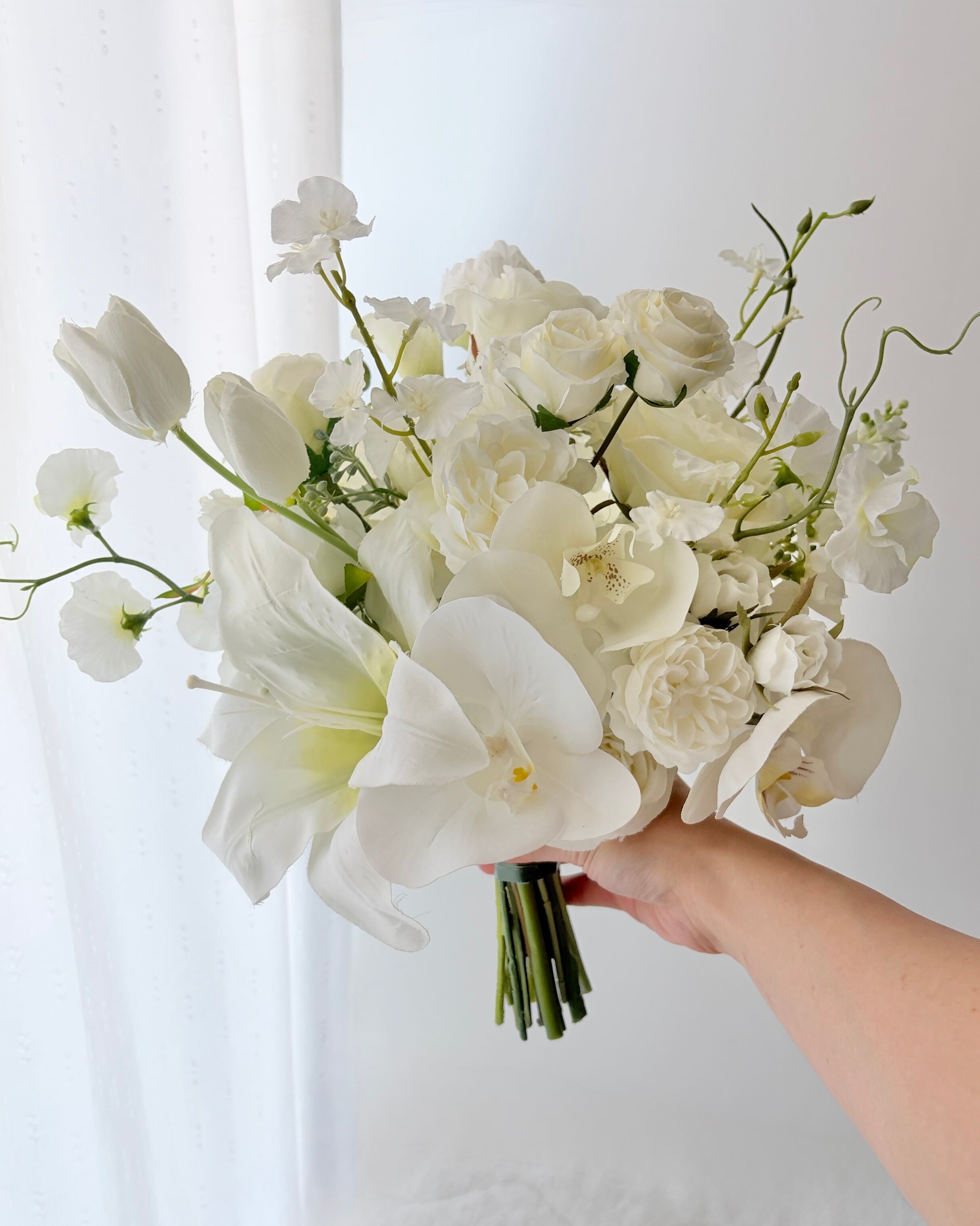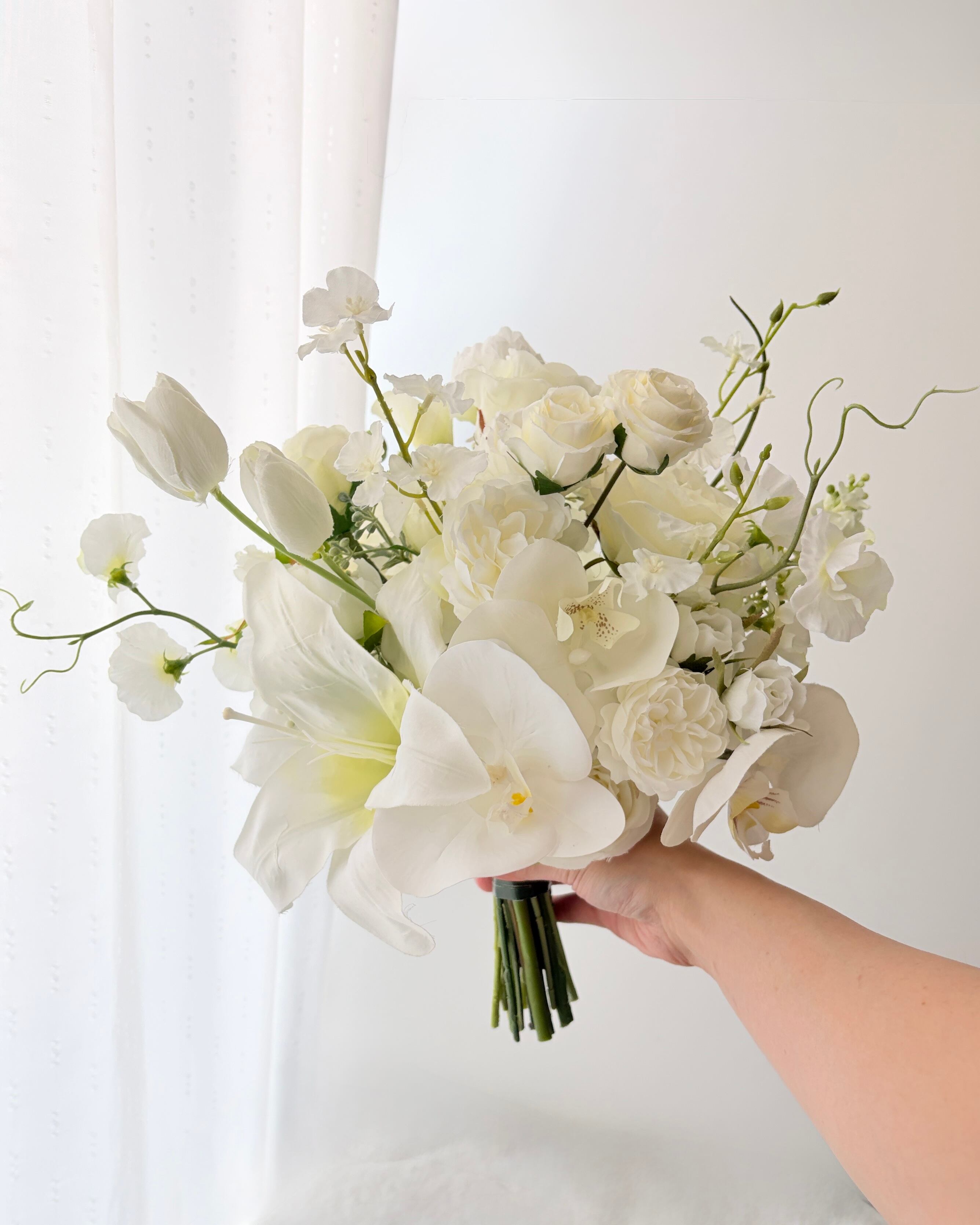 大輪のリリーが放つ気品と、胡蝶蘭の優雅なラインが美しく調和し、花嫁さまの手元を華やかに演出します。