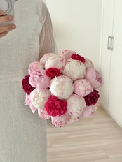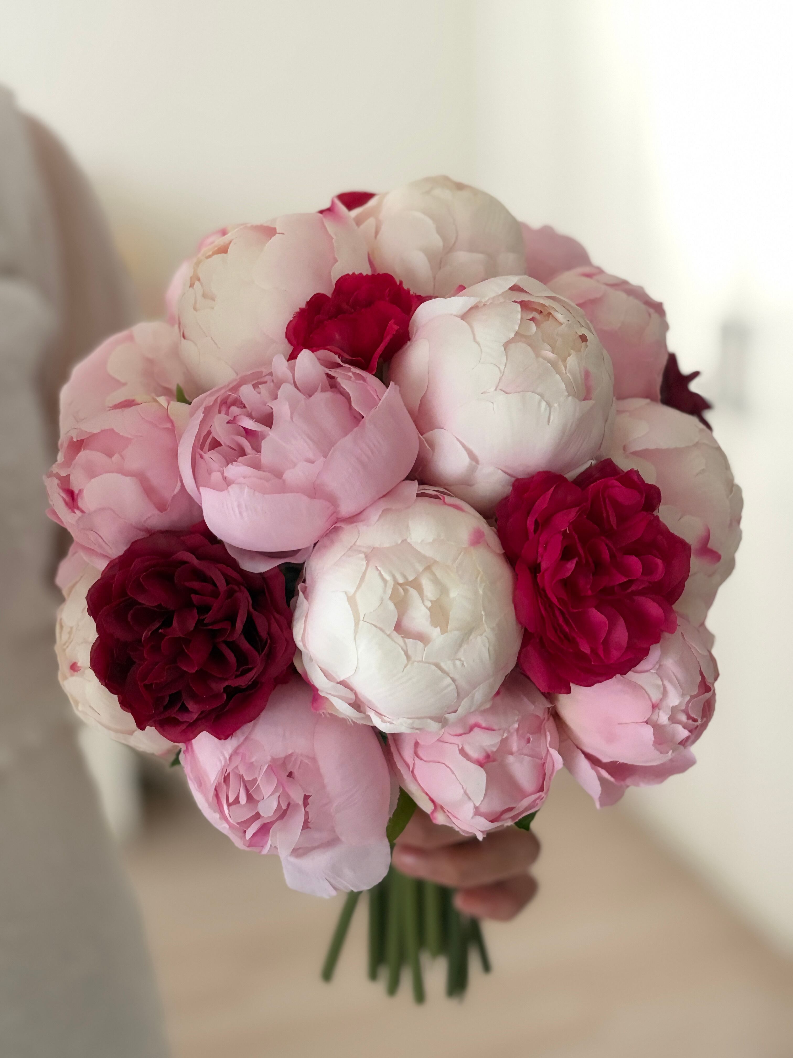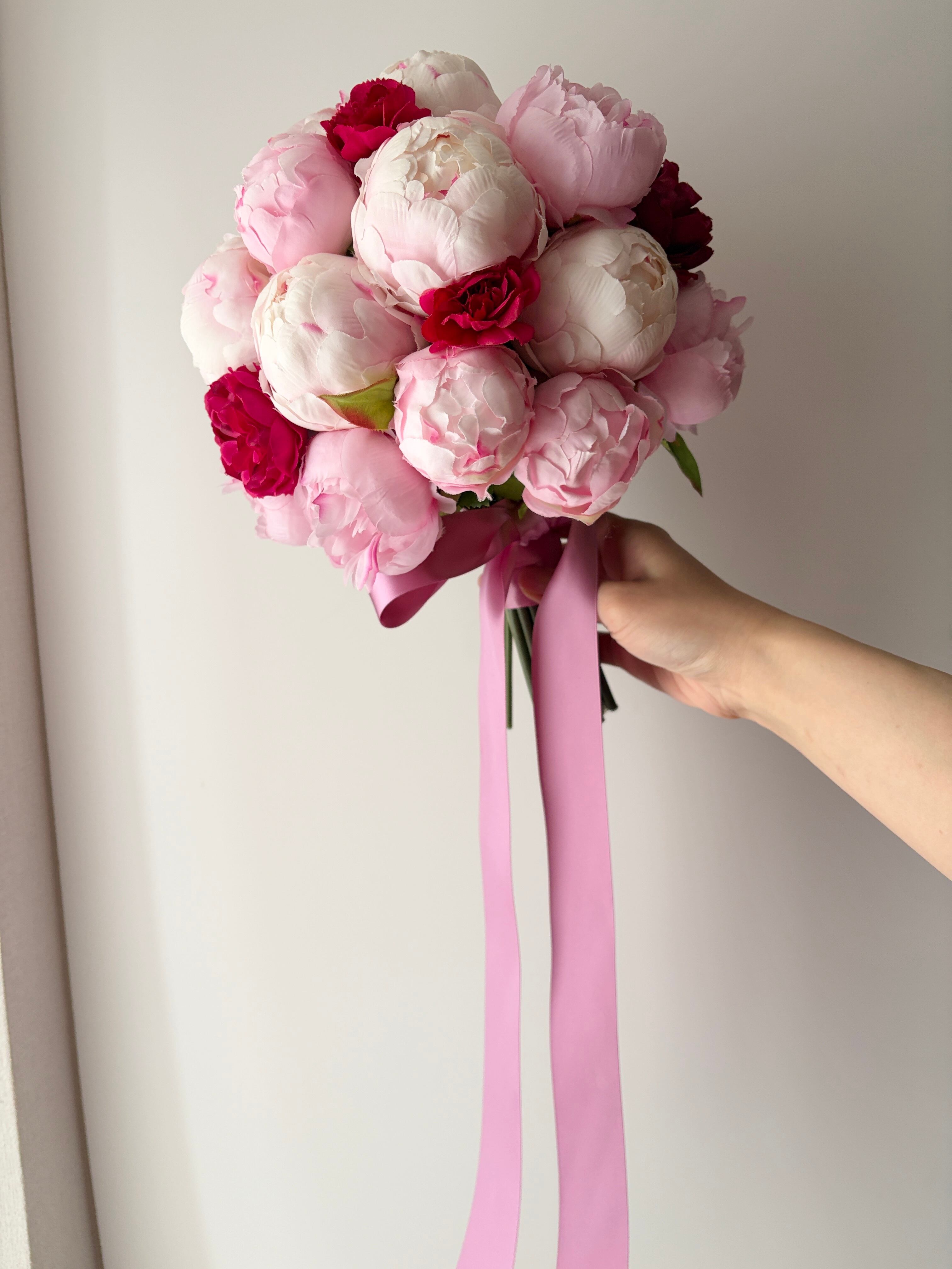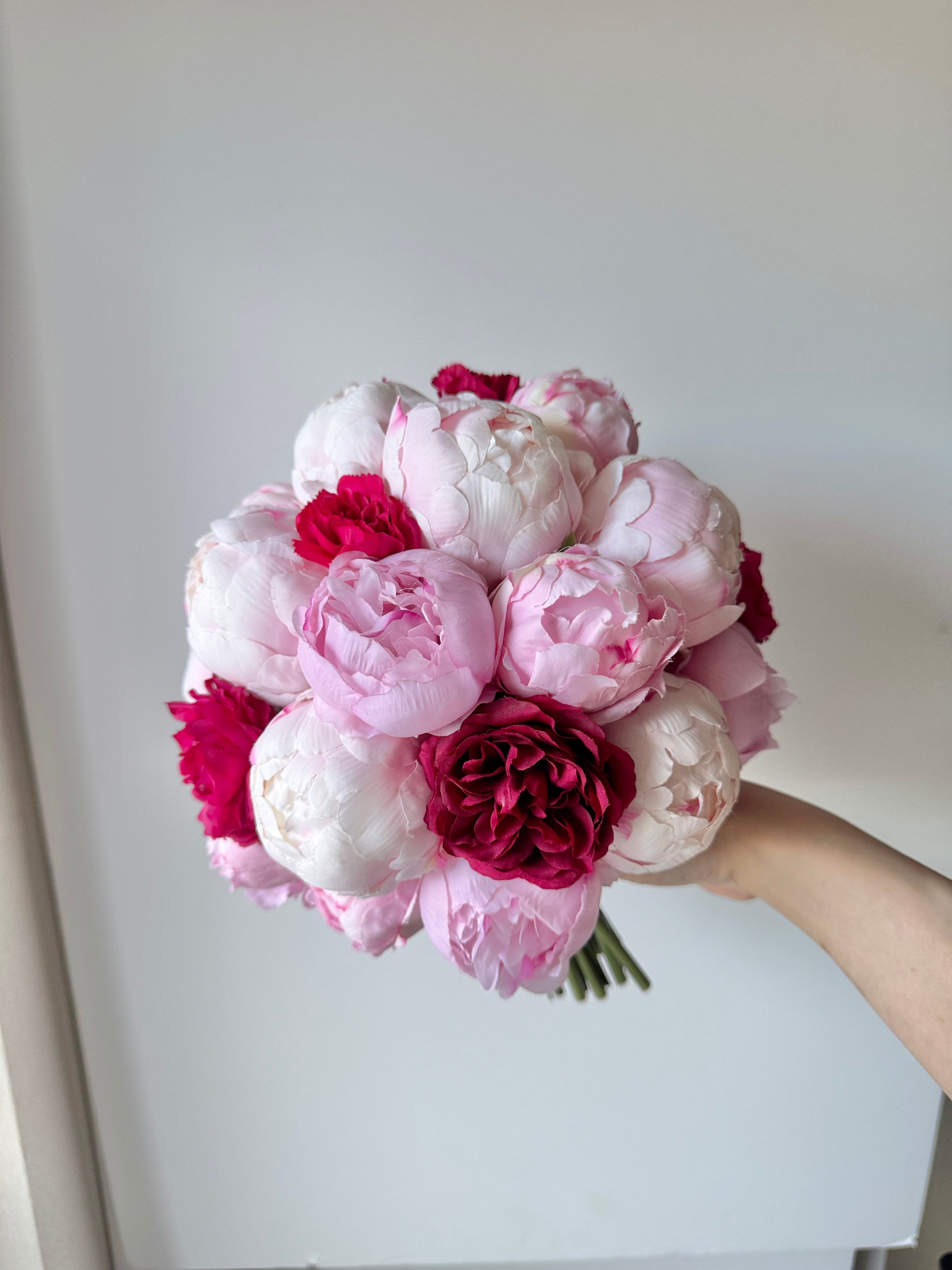 淡いピンクとディープピンクのグラデーションが美しい、存在感たっぷりの芍薬ピオニーのラウンドブーケです。
