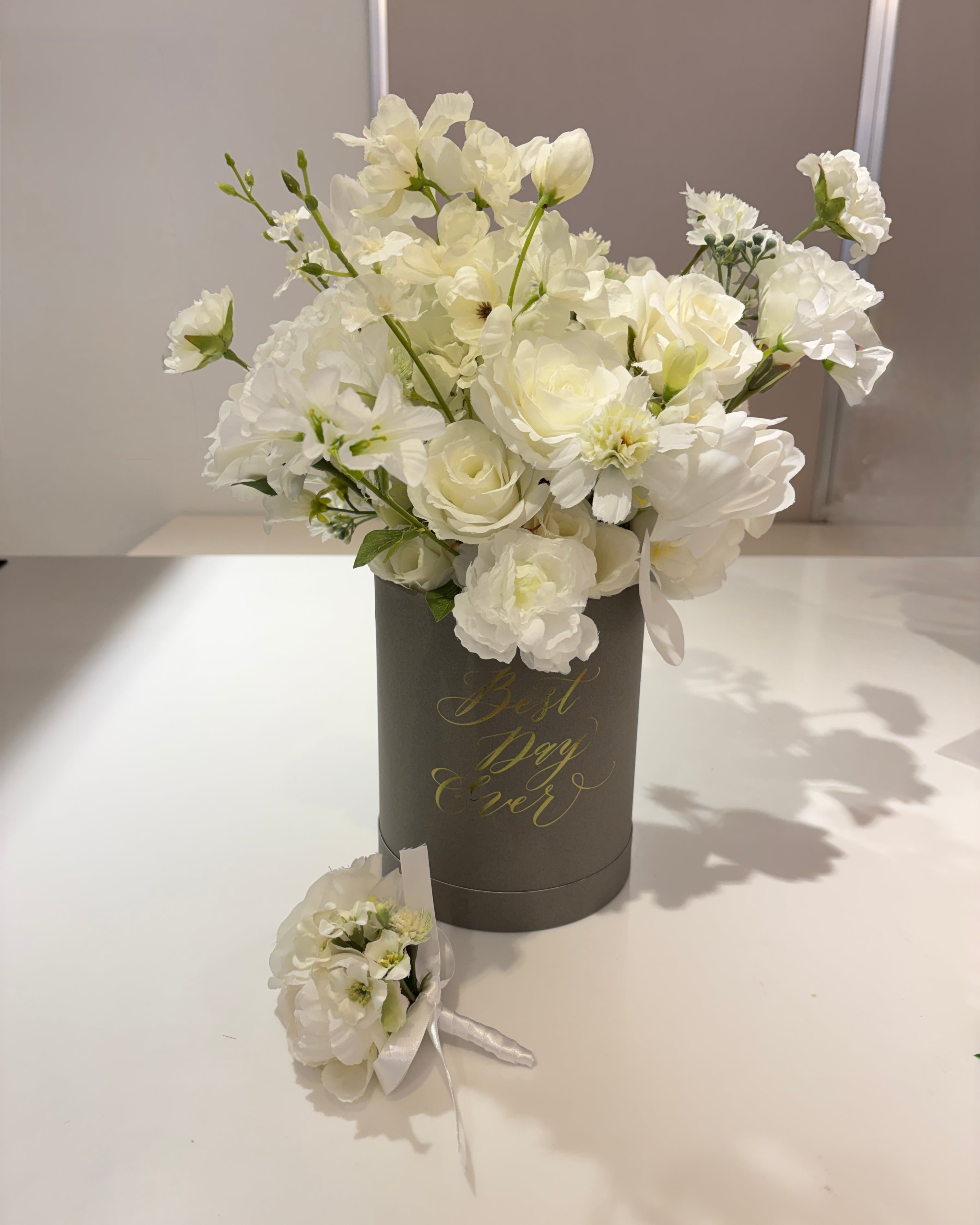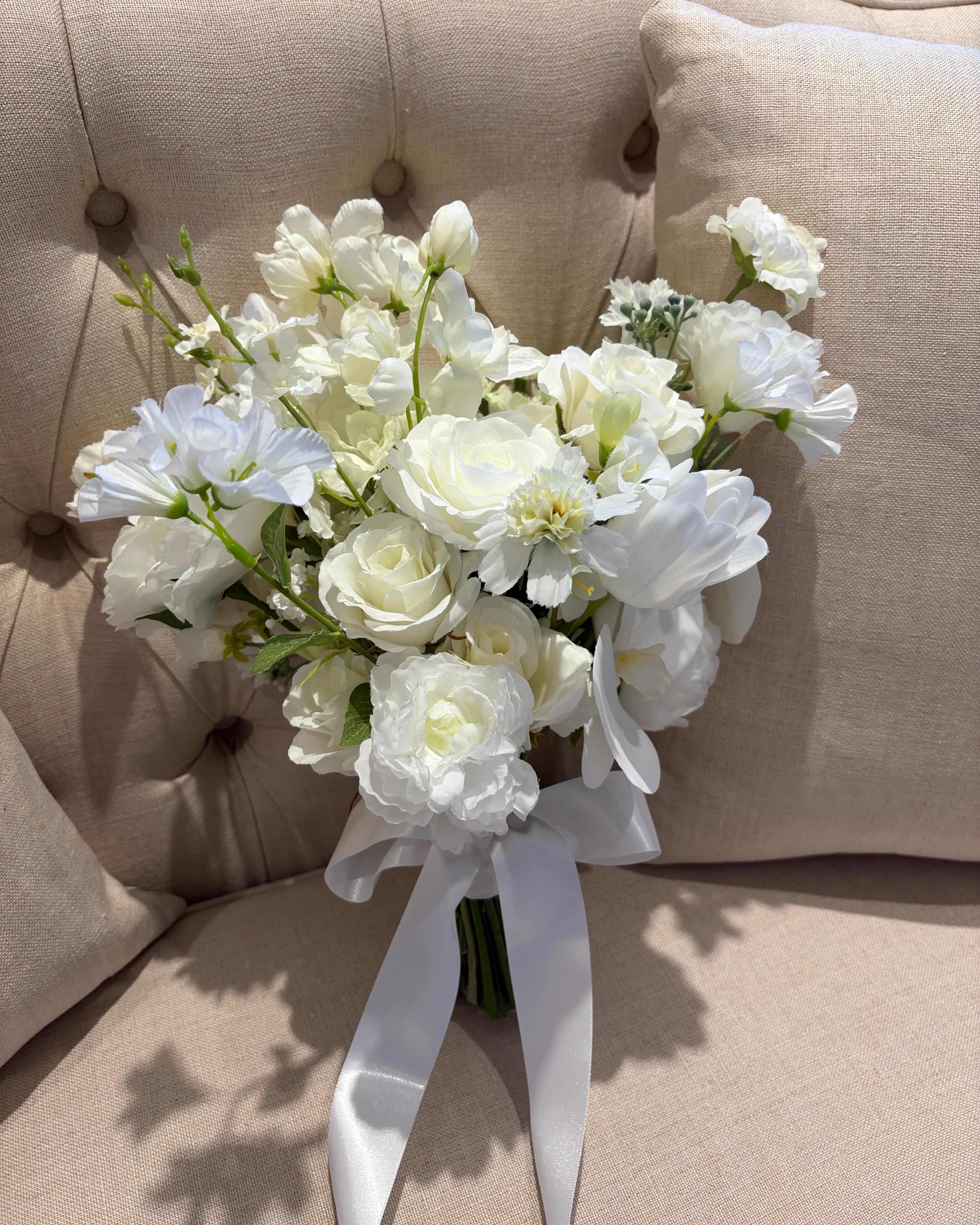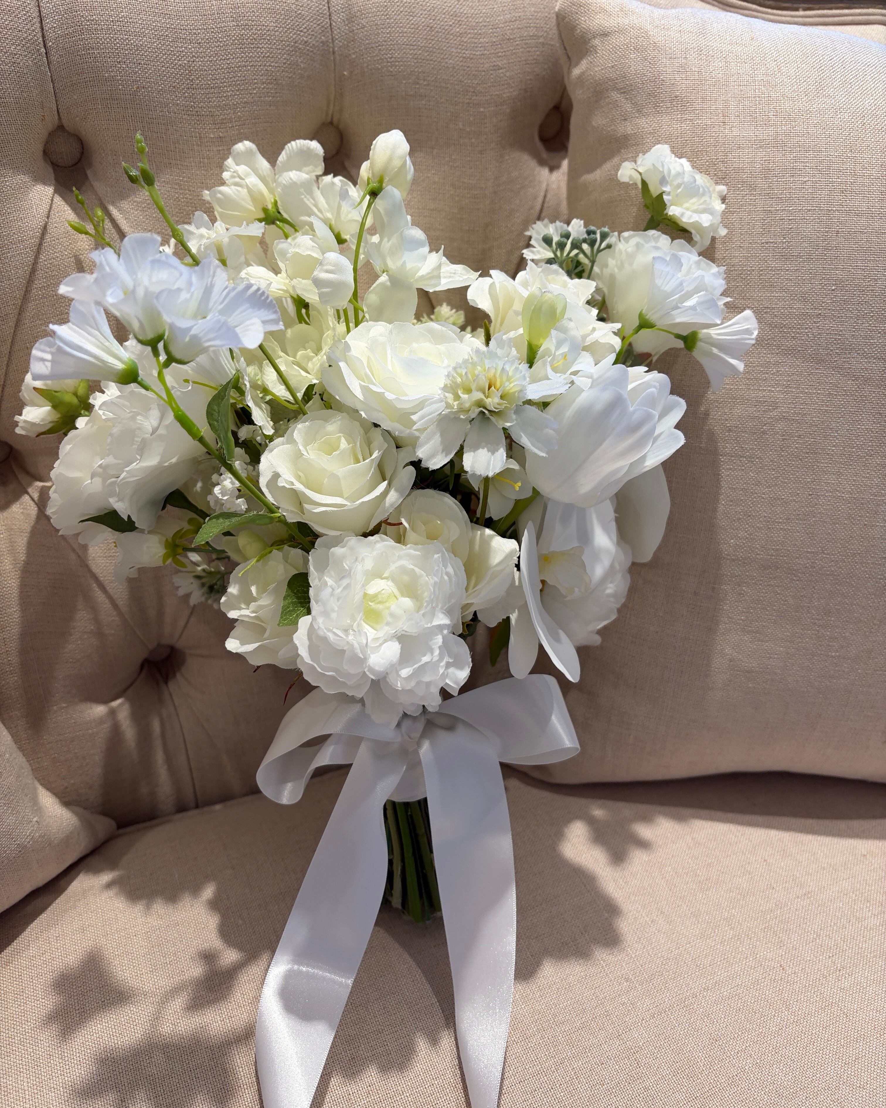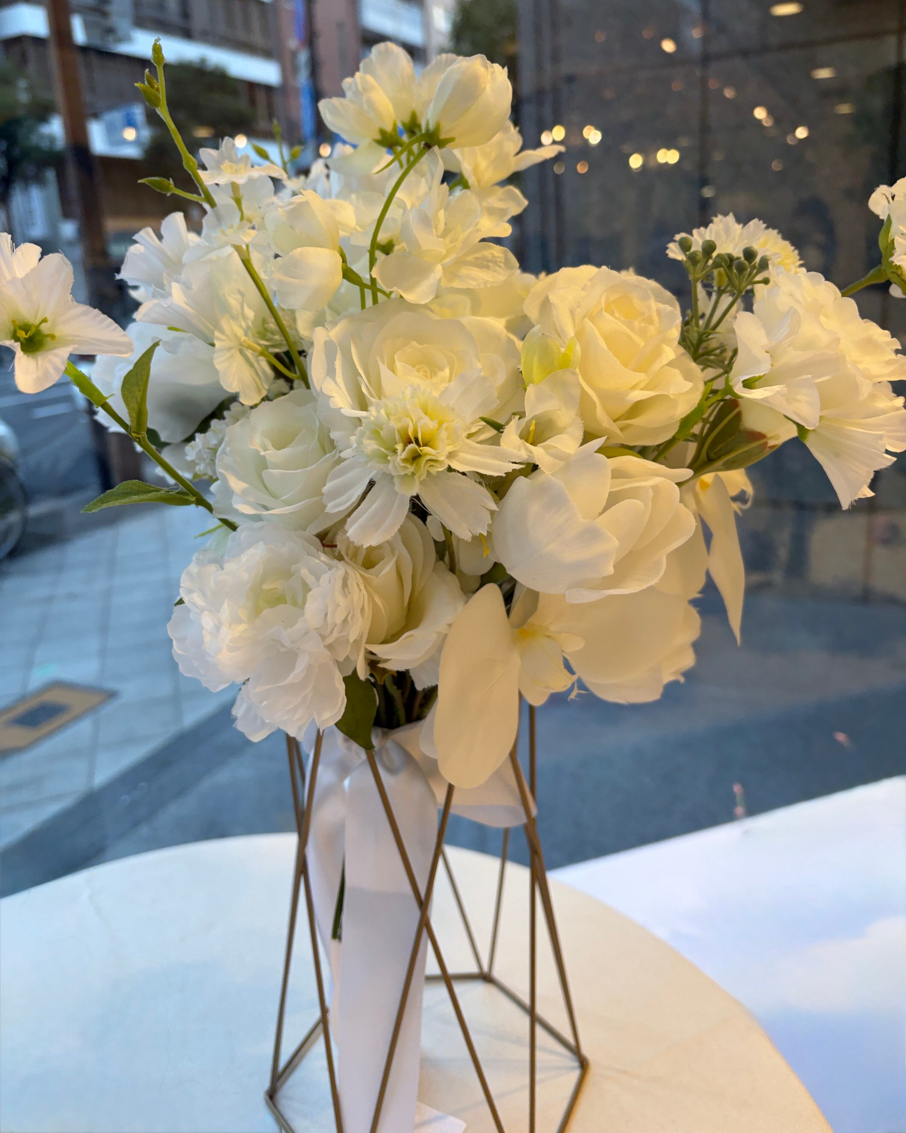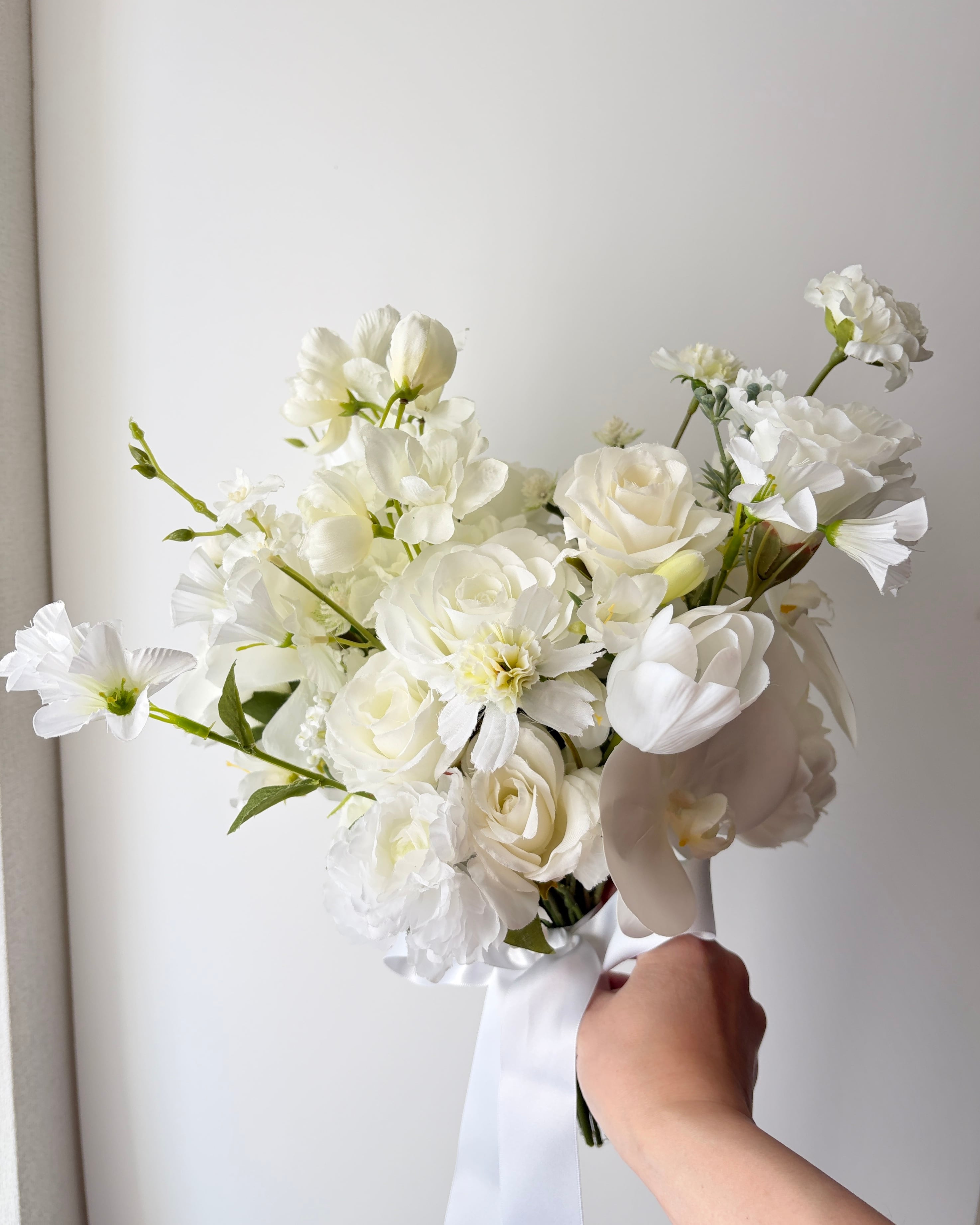 純白の花々が持つ静かな存在感は、ホテルウェディングやチャペル挙式、和装フォトなど、どんなスタイルにも上品に溶け込みます。