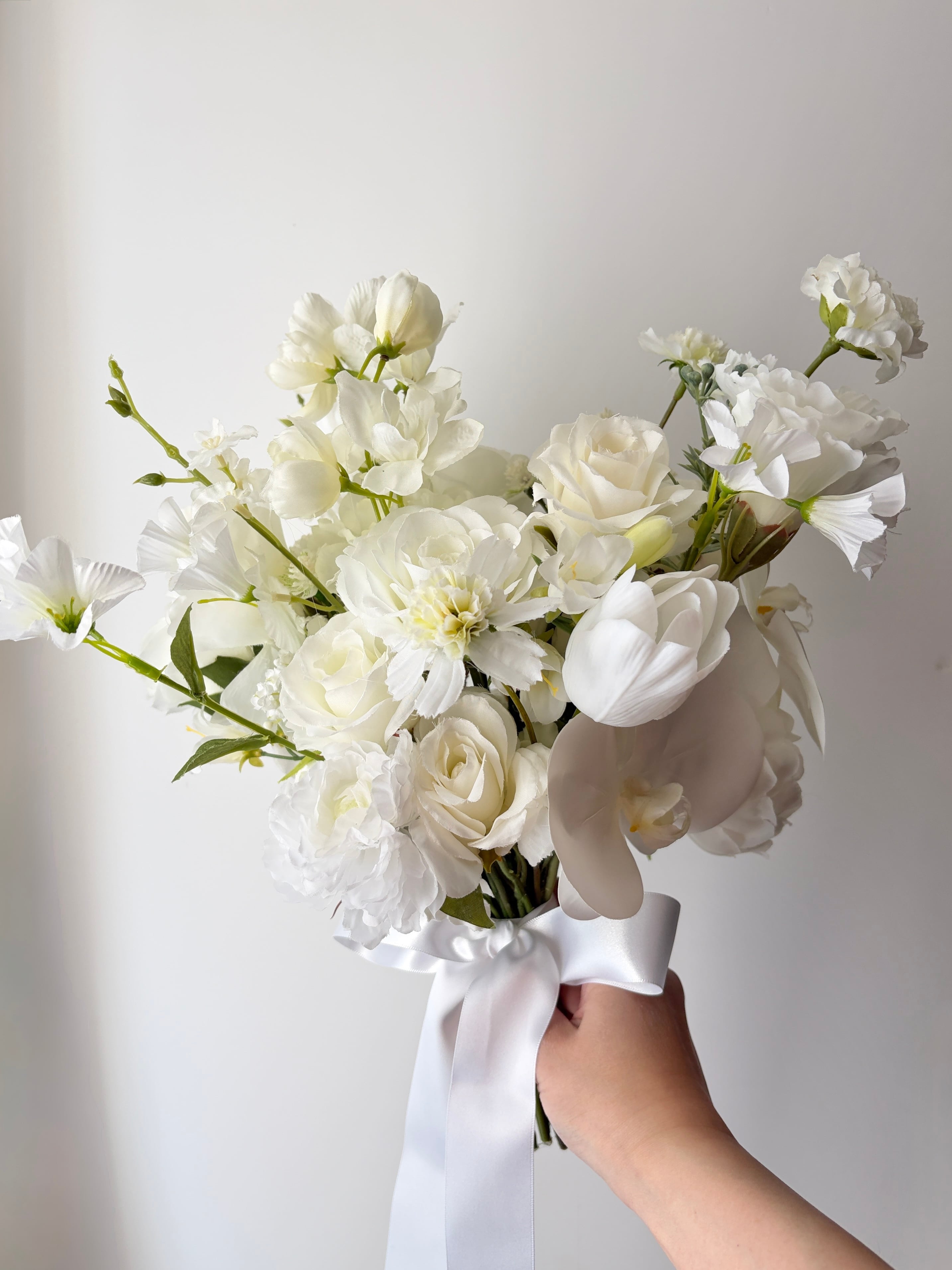 トルコ桔梗、オンシジューム、胡蝶蘭、ローズを中心に束ねた、純白のブーケ